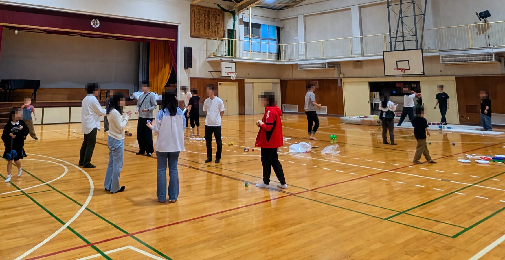 今回はシガーボックス、ボール、ディアボロ、皿回しの4種類を準備しました。体育館のエリアを4つに分けて、それぞれの道具を配置。興味がある道具のところに行って体験してもらう形をとりました。